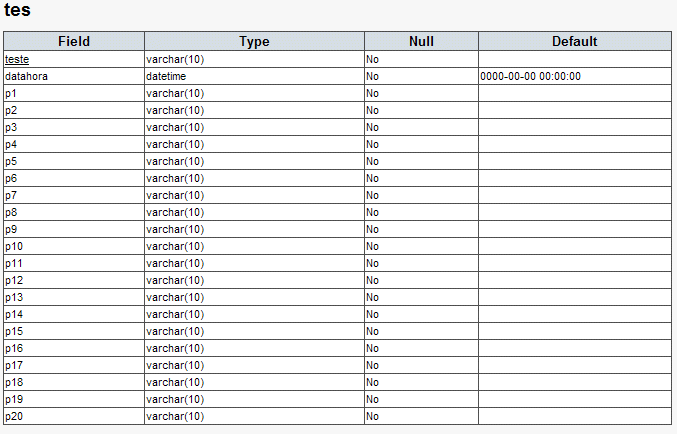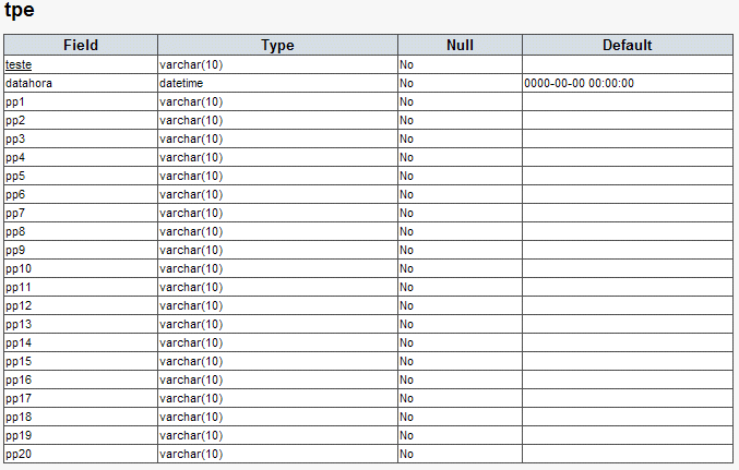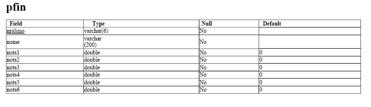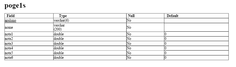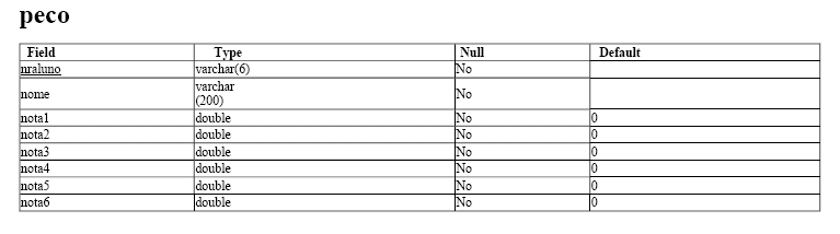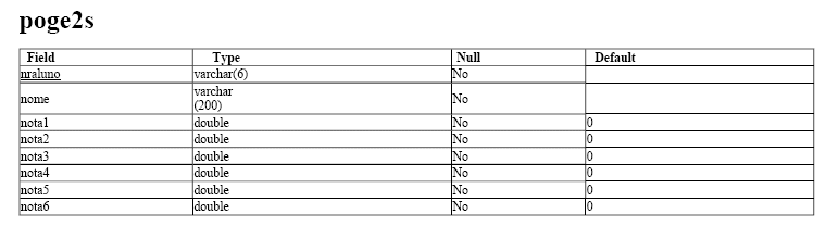 As tabelas 'peco', 'pfin', 'pgei', 'pige', 'poge1s' e 'poge2s', têm todas a mesma estrutura e respeitam às diferentes licenciaturas para que estes testes foram criados. O campo 'nraluno' será a identificação do utilizador no sistema ('login'), após o concretização do pré-registo.