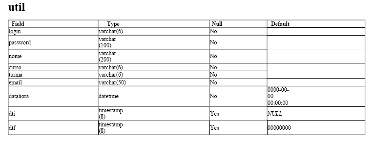 Tabela 'util' - registos dos 'login', 'password' e 'curso' dos utilizadores com indicação da data de registo e de datas de início ('dti') e de fim ('dtf') da capacidade de aceder a testes. Fica também registada a 'turma' e endereço de 'email' indicados aquando do pré-registo.