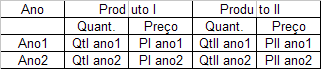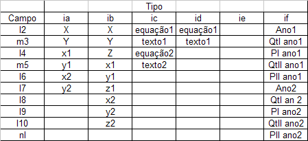 if - texto (campo 'm1'), tabela com 2 linhas e 5 colunas com cabeçalhos fixos (Ano, Qt. I, Preço I, Qt. II, Preço II) com o seguinte formato: