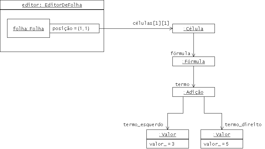Diagrama de objectos mostrando uma célula com fórmula 3 + 5: